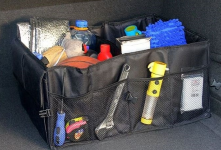 • Сумка-органайзер в багажник. Она поможет легко и аккуратно хранить вещи и инструменты. С помощью такого аксессуара даже ничего не понимающий человек может грамотно укомплектовать свой авто. Лучше покупать сумки из плотной ткани с множеством карманами. Обязательно, чтобы органайзер был оборудован липучками для крепления к карпету.