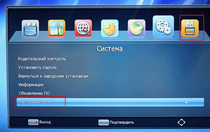 -Нажмите на пульте приставки кнопку «Menu». В выпавшем окне найдите картинку (вкладку) «Система». Нажмите «ОК» - вам на выбор представится список настроек. Кнопкой "вниз" на пульте опуститесь до «Настройка сети»