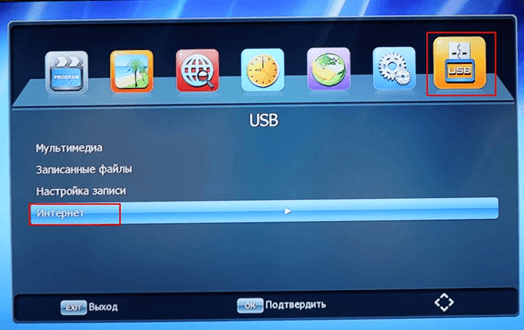 далее стрелками на пульте выберите поле «Интернет» и нажмите кнопку «ОК»