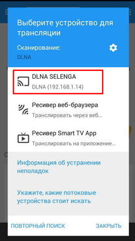 и в выпадающем окне, находим DLNA SELENGA и нажимаем ОК, подтверждая выбор.