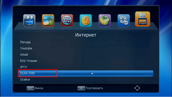 Далее нам необходимо зайти в меню приставки и выбрать DLNA – DMR: