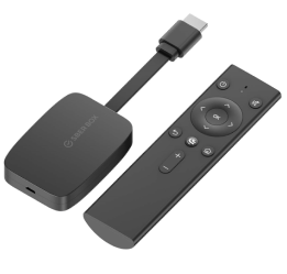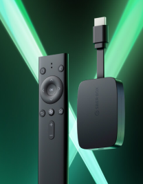 Конструкция устройства миниатюрная, оно весит всего 62 г и внешне напоминает флэшку. Черный цвет позволяет гармонично вписать приставку в любой дизайн телевизора. В комплект входит пульт с кнопками меню, регулировки громкости и вызова виртуальных помощников. Питается пульт от батареек (входят в комплект).