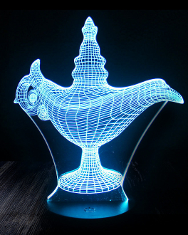Фигурку устанавливают на подставку, в которую монтируют светодиоды и переключатель. Бюджетные модели имеют USB порт и кабель, блок питания отсутствует. Более дорогостоящие устройства оснащены блоком питания, который может заряжать от розетки. В дневное время включенный светильник 3D не даст никакого эффекта, а вот ночью порадует волшебством трехмерного изображения.