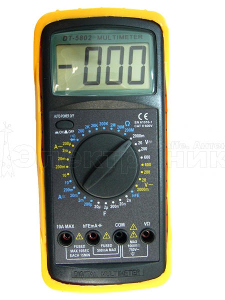 Технические характеристики: Разрядность дисплея: 3 3/4; Максимально индицируемый параметр измерений: 1999 Количество измерений в секунду: 2-3; Постоянное напряжение: 200mB-600В; Точность (пост. напряжение): ±0,5%; Переменное напряжение: 200mB-750В; Точность (переем. напряжение): ±1,2%; Постоянный ток: 2мА - 10А; Точность (пост. ток): ±0.8%; Переменный ток: 2мА - 10А; Точность (перем. ток): ±1,2%; Сопротивление: 200Ом - 200 МОм; Точность (сопротивление): ±0,8% Входное сопротивление: 10 МОм; Емкость: 2нФ / 20мФ; Точность (емкость): ±4%; Частота: 2кГц / 20кГц; Точность (частота): ±3%; Коэффициент усиления транзисторов: до 1000; Режим прозвонка: до 50 Ом; Питание: 9В; Габариты: 189 х 91 х 31,5 мм; Вес с батареей: 310 г.