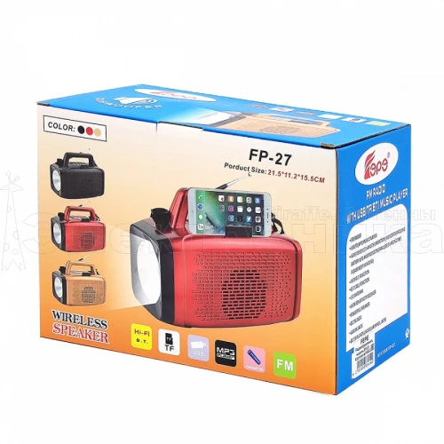 Bluetooth/FM Фонарик 1LED Встроенный микрофон AUX(3.5мм) вход/ USB/ TF до 32Гб Выход питания: USB-5В microUSB - шнур ЗУ в комплекте Питание: от аккумулятора 18650 (1200mA) - в комплекте Bluetooth: есть FM: 88-108 MHz USB: есть AUX: есть Встроенный аккумулятор: нет AM: нет SW: нет Размер: 215*112*155 мм Материал: пластик