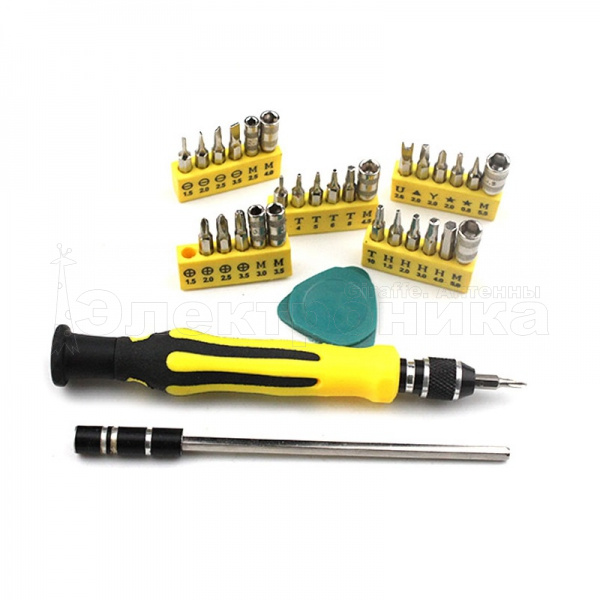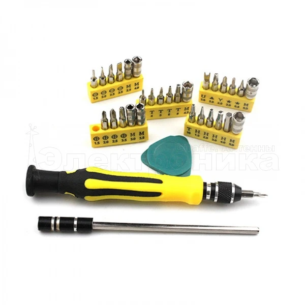 30 различных насадок Быстрая и удобная смена насадок Удобный футляр для хранения набора Длина отвёртки 115 мм Пластина для вскрытия корпусов